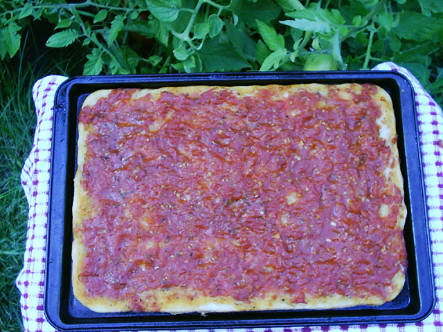 Prepare the pizza dough and place on a rectangular or round-shaped pan.