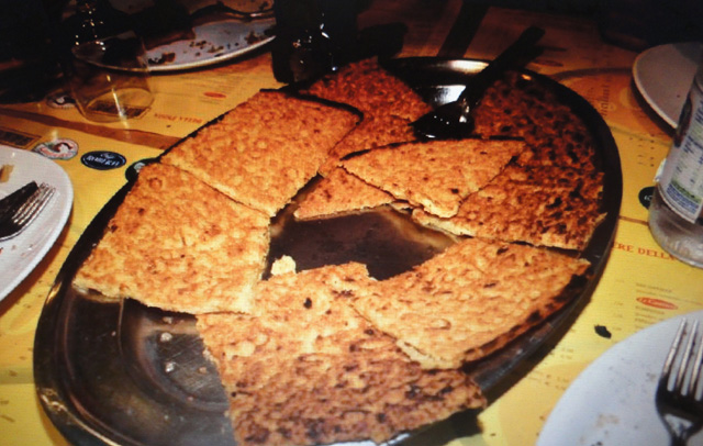 Notes The following text comes from Italian Wikipedia (Machine Google translation): "Cecina (or chickpea flour or cake chickpeas) Slices of porridge Origins Place of origin Italy Regions Liguria Tuscany County of Nice Area of production Throughout the region Details Category dish Recognition PAT Sector Product Plant The farinata (in Genoa Faina), also called cake chickpeas or Cecina, is a very small pie, made with flour of chickpeas, water, salt and olive oil. It is baked in a wood oven, in a pan, with cooking and takes a lively golden color. Has very ancient roots: different recipes Latin and Greek report baked mashed vegetables, cooked in the oven. A legend says that he was born by chance in 1284 , when Genoa defeated Pisa in the battle of Meloria. The galleys Genoese, laden with rowers prisoners found themselves involved in a storm. In the hustle and bustle of some oil barrels and sacks of chickpeas tumbled, salt water. Since supplies were those who were and there was not much to choose from, you retrieved the can and sailors were given bowls of mashed chickpeas and shapeless oil. In an attempt to make it less worse, some plates were left in the sun, she wiped the mixture into a kind of pancake. Returning to earth, the Genoese thought to improve the discovery of improvised cooking the puree in the oven. The result pleased, and for mocking the vanquished, was called the gold of Pisa. The same legend is told in Pisa , with some changes (the episode of the barrels seems to have happened on the Pisan galleys). Since the chickpeas fundamental part of the Pisan cuisine is likely to think that the Cecina has developed in this area and then be exported from the Pisan sailors during the era of Republican Preparation Mix one part of chickpea flour and 3 to 4 parts water in a bowl, add salt and stir vigorously to dissolve any lumps of flour (possibly crushing against the wall of the bowl with a spoon. Allow the mixture to stand for some hours (from two to 10 hours and even more), stirring occasionally to prevent the settling of the flour and dissolving always the lumps residues. Grease a baking tin plated copper with a thin layer of olive oil (one part oil to 5-10 parts of chickpeas) and pour the mixture from the center of the pan (the thickness should be at least 5 mm but less than 1 cm). "Breaking" the oil with a wooden spoon from the edges toward the center of the pan (up to bring forth oil stains scattered on the surface) and bake in the oven already hot. In the very first stage of cooking is important to turn the pan so as to maintain a uniform thickness (it is very difficult that the oven is completely level this avoids having thicker parts and undercooked and parts too thin and burned). You can enrich the porridge recipe before baking sprinkle with rosemary, artichokes and onions or half cooked with soft cheese, blue cheese, sausage or whitebait , fish typical of the Ligurian coast. Classically trained To dissolve the gram flour with water and a pinch of salt in a bowl. Allow to stand one hour, with a spoon remove the foam that is formed on the surface and pour the amalgam obtained in a shallow roasting pan with a diameter of about 32 cm previously greased with extra-virgin olive oil. Turn the whole so that the oil is at the surface and bake at 250 for 20 minutes. Before eating it is customary to add a pinch of pepper. Diffusion Socca of Nice It is a dish of some areas of the Mediterranean, especially the Ligurian cuisine and Tuscan cuisine coast. This is due to its characteristic of poor food, used as an alternative to bread, able to give sustenance thanks to vitamins , B and C and the phosphorus content in chickpeas and in the flour that is obtained from these and which constitutes the primary ingredient . Usually are used for preparing a wood oven and special pans or trays preferably in copper in which is fried at high temperature. There are many places where the chickpea flour is produced in several variants. It is commonly found along the coasts of the Mediterranean, between the Maremma and the French Riviera : In Cote d'Azur is called socca original term of the dialect of Nice and then borrowed in French , in the Toulon last area where this specialty has run spread, called falls . In Liguria the dish is very popular in the whole territory and is known as porridge or, more precisely, as Faina de in Genoa or fain? in La Spezia dialect. In Savona is also known as turtellassu. In Tuscany is known by different names. In Versilia and Pisano is called Cecina in Livorno is called cake chickpeas (combined with the bread, called 5:05) and in the coastal part of the province of Massa Carrara is called hot hot. In Lunigiana and Garfagnana is called porridge as in Liguria. In Piedmont , dall'alessandrino, all'astigiano to Turin was introduced by trade between Genoa and the Po valley and is called belecauda, very widespread, especially in the kitchen of Oltregiogo, sub-region of the province of Alessandria linked culturally and, until 1859 administratively to Liguria. In Sardinia , where he was brought by Genoese, called fain and is distributed mainly in Sassari. With the name of Faino is known to Carlisle, Genoese colony of island of San Pietro where they sell in the many pizzerias (the so-called tasclli). In Corsica, is a typical dish of Bonifacio, where she was taken by the Genoese. A Ferrara was introduced by a restaurant Pisa few decades ago, and is now one of the most popular dishes of food cutting. A Gibraltar was introduced by the rich Genoese colony that lived in the area since the early decades of the eighteenth century. Still widespread, is known as calentita and is considered a typical dish of the resort. In Uruguay and Argentina, where it came to about immigrants from Genoa, is known as fain? and over time has become a traditional dish in both countries of the Rio de la Plata . It is commonly eaten over the pizza. To remember also that the chickpea flour is the protagonist other reci