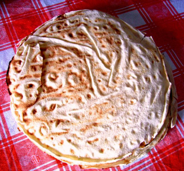 Notes The following was taken from the Italian Wikipedia (Machine google translation): Carasau, bread carasadu, Carasatu bread, bread 'and cutter Carasau Origins Place of origin Italy Region Sardinia Area of production Barbagia , Sardinia North Central Details Category dish Recognition PAT Sector Fresh pasta and bakery products, confectionery, biscuits and confectionery The bread carasau, Carasatu, carasadu or bread 'and cutter is a typical bread Sardinian, a native of Barbagia and spread throughout Sardinia , known as the Italian music paper for its characteristic crispness, which makes it noisy chewing. The term derives from the verb Sardinian rot or hariare, which indicates the characteristic modes of kneading the dough. Origins It has been suggested that some representations, some so-called cups of cooking and doubtful traces of bread roll will make it possible to assume that some sort of carasau product was already in the ' Bronze Age civilization which corresponds nuragica. According to a different interpretation etymological, being in dialect "knows dear" = the face, carasau mean "facing", since the dough is "facing" in the oven for a few moments up to the moment in which, after the same has been inflated , is rapidly removed from the oven to be divided into two parts with the knife. Its features make it very functional in the world agropastoral because its easy storage allowed to the shepherds, who remained long away from home engaged in the care of the flocks, you always have the bread which, when wet at the time of the meal, regained the freshness of the bread of the day. Even today in Palestine is being prepared bread perfectly equal to carasau, since the Barbagia has been in the past land subject to raids by the Saracens, so that the country of Dorgali or "Turcali" (ie country of the Turks) was populated by Berbers (many women Dorgalesi had frizzy hair and reddish typical Berber women) who have imported the filigree work designs still very similar if not identical to those traced in the North African coast. But in addition to a material aspect of traditional food, this bread is also considered under an anthropological, as its traditional home preparation involves a process of socialization. Ingredients The basic ingredients are yeast , salt, water and flour of wheat. The two main types of dough are one made of fine wheat flour (most valuable) and consumed by the wealthiest families, the other made from barley flour or bran, dark, consumed by the poor. Carasau The various phases of bakery called hotta knows or knows cooked Sa Cotta is the name in Sardinian language with which it is given the full cycle of preparation and baking of bread. Until a few decades ago was a real rite family and neighborhood involving at least three women, friends or relatives who received in exchange for oil and cottage cheese or simply reciprocated the help. Here are the steps: S'inthurta S'inthurta is the first phase of the process and takes place before sunrise. The yeast previously dissolved in warm water to flour is mixed sieved ( sedattu ) and kneaded in a trough of wood called in variants of the Sardinian iscivu , Lacu , lachedda , or in a hollow terracotta ( tianu , impastera ). There are many variations on the preparation of the dough, about his work and the baking of bread, variations that determine nuances of flavor, lightness of the pastry, the same size, and following old family traditions or festivals. Rot or hariare During this second phase, the dough is worked vigorously on the table (mesa pro knows of bread , knows mesitta), in the past not yet far too kneeling on the same cupboard. The fresh pasta is squeezed, the pressure of the enlarged with fists and rewound on itself, with the addition of water is manipulated with force ( ammoddihare ) until the dough is smooth. By this stage depends very much on the success of the bread and its duration is different for the many varieties. For carasau or other bread wheat is necessary to continue as long as more the dough is well-crafted, the result will be more valuable. This stage is very difficult and often women are helped by men. Weigh The leavening phase is called weigh (up). The well-crafted pasta is placed in special containers such as clay pots or in Barbagia in the Malune cork, covered over with sheets of wool. Leave the dough to rest while you prepare the tools for moving forward. Orire , sestare Once we see the start of the rising divide the dough together in regular touch ( sestare , orire ) that are rounded, floured and placed in special baskets ( sas horves , canistreddas ) wrapped in the folds of cloth of wool or linen to rest them ( Pasare ) again in order to continue rising. Illadare During this stage the dough is working with small wooden rolling pins ( canneddos , cannones ) and through the pads of the hands, infarinandola continuously, flattening and stretching it to form discs ( sas tundas ) of diameter varying in accordance with the locality. Obtained the diameter and the desired thickness, are deposited on the folds of special wool cloths called pannos de ispica or tiazas . These are special shoes, even ten meters long and 50 cm wide. Are usually held in coils, but in the moment of their use is gradually unroll first to the right for a distance of 50 cm, and - once deposited the dough spherical ( Sa tunda ) - to the left, to cover it completely, allowing in this way to file it another on the upper part of the fold, and so on in a succession of folds until the complete unwinding. Are then set aside and covered with blankets. Each pannu de ispica or tiaza , according to its length, can contain up to twenty tundas that are in this way easily transportable. Kokere For the oven using wood of oak or olive . Once introduced is placed in the center of the oven. After lighting the fire ( of inchendya de forru ), which usually occurs while preparing the thin spherical layers of dough, the oven begins to heat up and reach a tempera