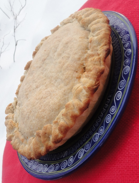 Ricoprite con l'atra meta della pasta stesa piuttosto sottilmente, pigiate intorno intorno per far combaciare i due dischi di pasta e con un coltellino asportatene il superflue.