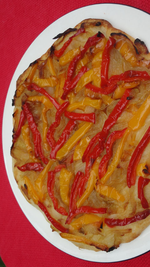 My favorite Montreal Italian pastry shop, "Italia, La Casa della Pizza," at 5540 Jean Talon Est, sells pizza topped with onions, red and yellow peppers. I am not privy to their recipe, but this is my take on it. One can reduce the cost substantially by using green peppers instead of red or yellow ones, but I won't recommend it, as the taste will be compromised. What makes this pizza special is its sweet flavor which is generated by the use of red peppers and the mild onions which are caramelized in the oven. Also, I recommend a rectangular pan for this style of pizza -- the light-colored aluminum pans sold in Middle Eastern shops seem to be quite good for pizza making. Photo: Mary Melfi. |