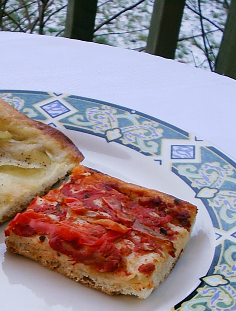 The dough recipe was put together by my late brother-in-law, a professional chef. The topping, however, was one that my mother often did. Prior to World War II most pizzas in Molise were garnished with stewed tomatoes, or served plain (without tomatoes). However, red and green peppers were added to the pizza topping when they were in season. |